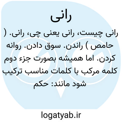 رانی. ( حامص ) راندن. سوق دادن. روانه کردن. اما همیشه بصورت جزء دوم کلمه مرکب با کلمات مناسب ترکیب شود مانند: حکمرانی، کشتیرانی، کامرانی، هوسرانی، شهوترانی و غیره؛ که عمل حکمران و کشتیران و... باشد.
