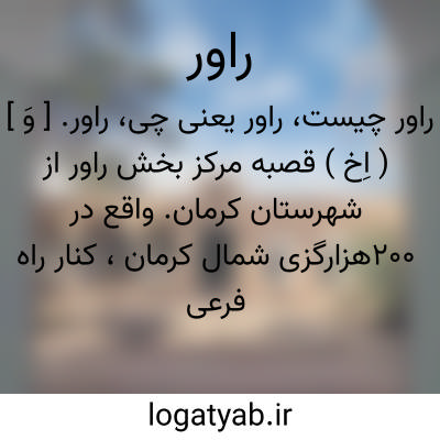 راور. [ وَ ] ( اِخ ) قصبه مرکز بخش راور از شهرستان کرمان. واقع در 200هزارگزی شمال کرمان، کنار راه فرعی کرمان - مشهد. این قصبه در جلگه واقع شده و هوای آن معتدل و جمعیت آن 2500 تن میباشد. آب آن از چند رشته قنات تأمین میشود.محصول عمده این قصبه حبوب، پنبه، میوه و لبنیات است. پیشه مردم کشاورزی و دامپروری و صنایع دستی زنان بافتن قالیچه، کرباس، گلیم و قالی با نقشه است. راور در حدود 200 باب دکان و دو دبستان دارد. ادارات دولتی عبارتند از بخشداری، دارایی، فرهنگ، پاسگاه ژاندارمری. انار راور بخوبی معروف است. ( از فرهنگ جغرافیایی ایران ج 8 ). موضعی است در وسط لوت نزدیک کوه بنان و به هشت فرسنگی آن معدن گوگرد است و گویند هم بدان نزدیکی معدن طلاست. ( یادداشت مؤلف ). و رجوع به جغرافیای سیاسی کیهان و فرهنگ آنندراج و انجمن آرا شود.
