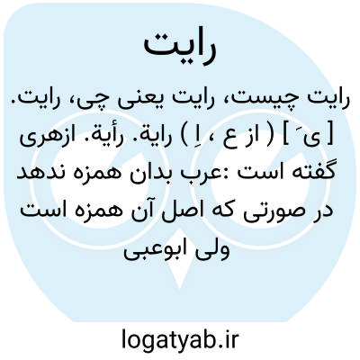 رایت. [ ی َ ] ( از ع، اِ ) رایة. رأیة. ازهری گفته است:عرب بدان همزه ندهد در صورتی که اصل آن همزه است ولی ابوعبید و اصمعی آنرا انکار کرده اند. ( از اقرب الموارد ). عَلَم. ج، رایات. ( اقرب الموارد ) ( ناظم الاطباء ) ( از شعوری ج 2 ورق 3 ). علامت. بیرق. درفش. لوا. ( ناظم الاطباء ). علم خرد. ( زمخشری ). علم لشکر. ( منتخب اللغات ) ( غیاث اللغات ) ( از آنندراج ) ( از فرهنگ نظام ). در مغرب علم سپاه را گویند و ام الحرب کنیه آن است و آن از لوا بلندتر و بزرگتر است. ( از اقرب الموارد ) ( از المنجد ). علم. ( دهار ) ( مهذب الاسماء ):