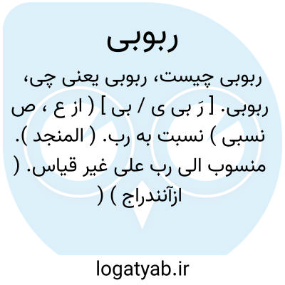 ربوبی. [ رَ بی ی / بی ] ( از ع، ص نسبی ) نسبت به رب. ( المنجد ). منسوب الی رب علی غیر قیاس. ( ازآنندراج ) ( منتهی الارب ) ( ناظم الاطباء ). خدایی. الهی.منسوب به رب بدون قیاس، یا به ربوبیت و باء فتحه داده شده است چنانکه در بصری است. ( از اقرب الموارد ).