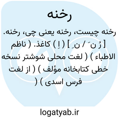 رخنه. [ رُ ن َ / ن ِ ] ( اِ ) کاغذ. ( ناظم الاطباء ) ( لغت محلی شوشتر نسخه خطی کتابخانه مؤلف ) ( از لغت فرس اسدی ) ( از فرهنگ اوبهی ) ( فرهنگ جهانگیری ) ( آنندراج ) ( از برهان ) ( فرهنگ رشیدی ) ( فرهنگ سروری ) ( فرهنگ نظام ). قرطاس. ( لغت محلی شوشتر ) ( از برهان ):