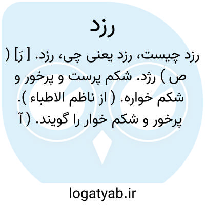 رزد. [ رَ] ( ص ) رژد. شکم پرست و پرخور و شکم خواره. ( از ناظم الاطباء ). پرخور و شکم خوار را گویند. ( آنندراج ) ( برهان ). شکم خوار. ( انجمن آرا ).بسیارخواره را گویند. ( فرهنگ سروری ). شکم باره. ( یادداشت مؤلف ). اکول و بسیارخوار. ( از شعوری ج 2 ص 4 ). ورجوع به رژد شود. || ( اِ ) بسیارخواری. ( فرهنگ رشیدی ):