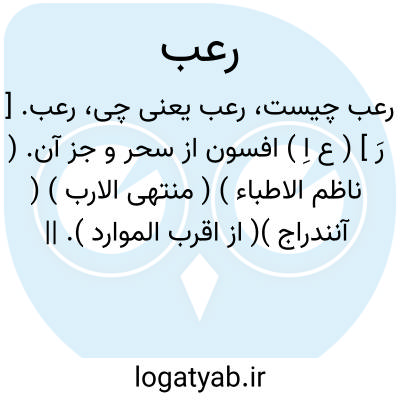 رعب. [ رَ ] ( ع اِ ) افسون از سحر و جز آن. ( ناظم الاطباء ) ( منتهی الارب ) ( آنندراج )( از اقرب الموارد ). || وعده بد. ( ناظم الاطباء ) ( منتهی الارب ) ( آنندراج ). وعید. ( اقرب الموارد ). || عذاب. ( ناظم الاطباء ) ( منتهی الارب ) ( آنندراج ). || سخن عربی دارای سجع. ( ناظم الاطباء ) ( منتهی الارب ) ( آنندراج ) ( از اقرب الموارد ).