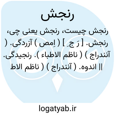 رنجش. [ رَ ج ِ ] ( اِمص ) آزردگی. ( آنندراج ) ( ناظم الاطباء ). رنجیدگی. || اندوه. ( آنندراج ) ( ناظم الاطباء ). دلتنگی. ملالت. ( ناظم الاطباء ). ملال.