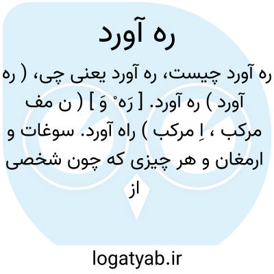 ( ره آورد ) ره آورد. [ رَه ْ وَ ] ( ن مف مرکب، اِ مرکب ) راه آورد. سوغات و ارمغان و هر چیزی که چون شخصی از جایی بیایدبرای کسی بیاورد اگر چه چند بیت از نظم و نثر باشد.( ناظم الاطباء ) ( از برهان ). کنایه از چیزی است که چون کسی از جایی آید به طریق تحفه آورد و سوغات نیز گویند. ( انجمن آرا ) ( از غیاث اللغات ). راه آورد. عراضه. سوقات. سوغاتی. سوقاتی. لهنه. ارمغان. هدیه که مسافرآورد از سفر. نورهان. ( یادداشت مؤلف ):