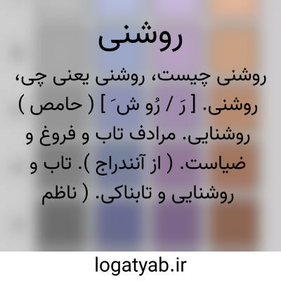 روشنی. [ رَ / رُو ش َ ] ( حامص ) روشنایی. مرادف تاب و فروغ و ضیاست. ( از آنندراج ). تاب و روشنایی و تابناکی. ( ناظم الاطباء ). ضیاء. سناء. ( ترجمان القرآن ). فروغ. فروز. نور. پرتو. شِرق. شَرق. بهر. ضوء. ضیا. ضیاء. سنا. ( یادداشت مؤلف ). مقابل تاریکی: