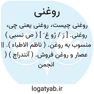 ( صفت ) ۱ - منسوب به روغن: ماده روغنی. ۲ - نانی که خمیر آنرا با روغن سرشته باشند روغنینه. ۳ - آنکه روغن گیرد روغنگر عصار.