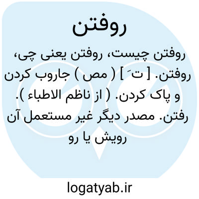 روفتن. [ ت َ ] ( مص ) جاروب کردن و پاک کردن. ( از ناظم الاطباء ). رفتن. مصدر دیگر غیر مستعمل آن رویش یا روب است. روبیدن. پاک کردن. جاروب کردن. خاشاک جایی را بیرون کردن. با جاروب یا جامه ای همه را بردن. ( یادداشت مؤلف ):