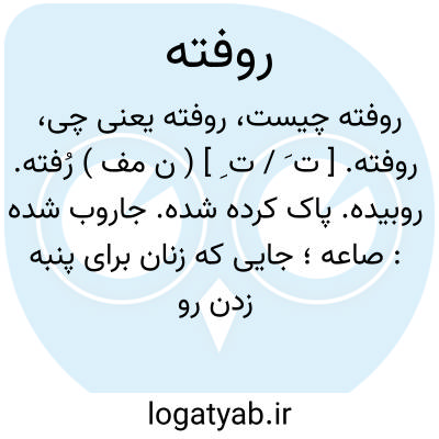 روفته. [ ت َ / ت ِ ] ( ن مف ) رُفته. روبیده. پاک کرده شده. جاروب شده: صاعه؛ جایی که زنان برای پنبه زدن روفته و آماده کرده باشند. ( منتهی الارب ). رجوع به رفته شود.