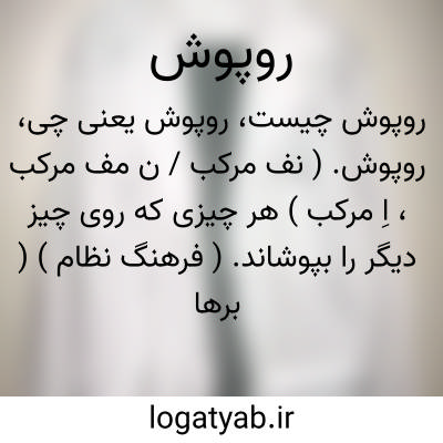فهم کن واﷲ اعلم بالصواب.مولوی ( از آنندراج ). || برقع. ( برهان قاطع ) ( انجمن آرا ) ( ناظم الاطباء ). || مقابل زیرپوش. جامه ای بلند و گشاد که از روی تمام جامه ها پوشند مانند روپوش پزشکان جراح هنگام عمل و روپوش پرستاران و کارگران و دختران دانش آموز. || مطلا. ( برهان قاطع ) ( انجمن آرا ) ( ناظم الاطباء ). فلزپستی که روی آن فلز بالاتری کشیده شده باشد مثل مفضض و مطلا. ( فرهنگ نظام ). ملمع. ( انجمن آرا ) ( برهان قاطع ) ( آنندراج ). ملمع و مطلا. ( لغت محلی شوشتر نسخه خطی ): و در دستگاه نقده سازی طلا، روپوش صدپنج معمول است و اگر زربفت بسیار زرین سنگین مقرر شود که بافته شود اعلی را صدده، و اعلای اعلا را صدپانزده روپوش می کنند. ( تذکرةالملوک بخش نخست ص 22 ). || هر چیز که ظاهر او مخالف باطن باشد. ( آنندراج ).کنایه از هر چیزی که ظاهراً و باطناً خلاف یکدیگر باشد. ( انجمن آرا ). هر چیز که ظاهر و باطن آن به یک نوع نباشد. ( ناظم الاطباء ). || ( ن مف مرکب ) روپوشیده. ( آنندراج ). مخفی شده و پنهان گشته از نظر. ( ناظم الاطباء ). || ( اِمص مرکب ) روپوشی: