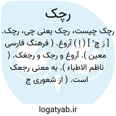رچک. [ رَ چ ُ ] ( اِ ) آروغ. ( فرهنگ فارسی معین ). آروغ و رجک و رجغک. ( ناظم الاطباء ). به معنی رجعک است. ( از شعوری ج 2 ص 9 ):