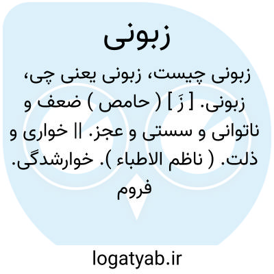 زبونی. [ زَ ] ( حامص ) ضعف و ناتوانی و سستی و عجز. || خواری و ذلت. ( ناظم الاطباء ). خوارشدگی. فرومایگی. قزم. ( از منتهی الارب ). زیردستی. فاقد شوکت و موقع اجتماعی بودن. ضد محتشمی: