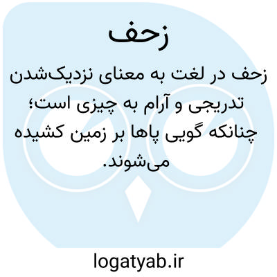 قبیل الصبح آثار السباط.( از اساس البلاغة ). || رفتن کودک بزانو. ( غیاث اللغات ). گاه زحف را بر «رفتن بر زانوان » اطلاق کنند، چنانکه شاعر گوید: فأقبلت زحفاً علی الرکبتین. ( از اقرب الموارد ). حبو. رفتن بر دست و پا. ( از قاموس عصری، عربی - انگلیسی ). || غیژیدن تیر که فرود نشانه افتاده تا نشانه. ( منتهی الارب ) ( آنندراج ) ( از اقرب الموارد ) ( ناظم الاطباء )( از محیط المحیط ). بنقصان رسیدن تیربر نشانه بطوری که تیر اول نزدیک بهدف بر زمین بیفتد بعد از آن بقوت باقی خود بهدف برسد. ( غیاث اللغات ) ( از متن اللغة ).سهم زاحف؛ آنکه نرسیده به نشانه فرو افتد. ( از اساس البلاغة ). زاحف تیری است که فرود نشانه افتد، سپس تا نشانه کشیده شود و این از معانی مجازی زحف است. ( از منتخب اللغات ) ( از تاج العروس ). || بعضی خطا شدن تیر نیز گفته اند.( غیاث اللغات ). || جهاد. ( آنندراج ) ( منتهی الارب ). در حدیث است که «اللهم اغفرله و ان کان فر من الزحف »؛ یعنی خداوندا او را ببخشای هر چند از جهاد و روبرو شدن با دشمن فرار کرده است. ( از تاج العروس ) ( از لسان العرب ). || سپلکشان رفتن شتر از ماندگی. و بهمین معنی است زَحَفان و زُحوف. ( از منتهی الارب ) ( آنندراج ) ( از اقرب الموارد ) ( از محیط المحیط ) ( از ناظم الاطباء ). این شتر را زاحف و مؤنث آنرا زاحفة گویند و ج ِ زاحفة، زواحف آید. و در مصباح آمده که، شتر نر را نیز زاحفة گویند با اضافه تاء مبالغه. ( از اقرب الموارد ): زحف البعیر؛ یعنی مانده شدشتر پس کشید سپل خود را از ماندگی. پس شتر نر را زاحف و در ماده زحوف و زاحفه و جمع آن زواحف می آید. ( از ترجمه قاموس ). زحوف و مزحاف، ناقه ای است که از خستگی سپل کشان رود. ج، زواحف، زُحَّف، مزاحیف. ( از لسان البلاغة ). زحف، زحوف و زحفان در شتر آن است که از خستگی سپل کشان رود. و آن شتر را زاحف، زحوف و زاحفة گویند. ج، زواحف. ( از تاج العروس ). و نعت از آن مزحف است و مزحاف. ( ازلسان العرب ). || پیش گردیدن ملخ پیاده. ( از منتهی الارب ) ( از اقرب الموارد ) ( از لسان العرب ): زحف الدبی؛ یعنی رفت ملخ بپیش و میل نکرد و برنگشت. ( ترجمه قاموس ) ( از لسان ) ( از تاج العروس ). || کون خیزه کردن. خود را با کون برزمین کشیدن، و بدین معنی است در حدیث «و یزحفون علی استاههم »؛ یعنی بر کون خزیدند، کون سره کردند. ( از لسان العرب ). راه رفتن با کون. ( از جمهرة ج 2 ص 148 ). || از آواز مطربان بوجد آمدن و از روی طرب کون سره کردن. ( از تاج العروس ). || آهسته پیش رفتن، و قدم بقدم رفتن لشکر بسوی جنگ. ( از غریب القرآن طریحی ). فرا جنگ شدن بانبوهی. ( مصادر زوزنی ص 252 ) ( تاج المصادر بیهقی ). بجنگ شدن بانبوهی. ( دهار ). تشبیه به زحف و خزیدن و کون سره کردن کودکان شده است بقدم آهسته رفتن هر یک از دو متخاصم بسوی دیگری، برای جنگ، پیش از نزدیک شدن و شروع زد و خورد. «مزاحف اهل الحرب »؛ یعنی آن فاصله ها که لشکریان با حرکت آهسته به سوی یکدیگر طی میکنند. زجاج در تفسیر آیت «اذا لقیتم الذی کفروا زحفاً» ( قرآن 15/8 ) گوید: یعنی هر گاه آهسته آهسته برای نبرد بسوی کافران رفتید، دیگر بآنان پشت مکنید ( از جنگ فرار مکنید ). ( از تاج العروس ) ( از لسان العرب ). میبدی در کشف الاسرار در تفسیر آیت «اذا لقیتم الذی کفروا...» گوید: زحف رفتن جنگی است پاره پاره روی بیک دیگر. هم خزیدن طفل. تزاحف وتقارب و تدانی یکی است، و مصدر آن زحف است، و زحف هیچگاه، بصیغه جمع در نیاید، مانند عدل و صوم. ( از کشف الاسرار ج 4 ص 18 ). || حرکت به کندی و سنگینی. گویند: مشیه زحف یا زحوف یا زحفان؛ یعنی گرانی و سنگینی در رفتن دارد. ( از اساس البلاغه ) ( از تاج العروس ). اندک اندک رفتن. ( از لسان العرب ) ( از متن اللغة ) ( از تاج العروس ). || خسته شدن. همچنین است زحفان. ابوسعید ضریرگوید، زاحک و زاحف، خسته را گویند و مذکر و مؤنث در آن یکسانست. ( از تاج العروس ). خستگی. ( از تاج المصادر بیهقی ): «زحفت رکابهم »؛ یعنی مرکوبان ایشان مانده شدند. ( از اساس البلاغة ). || ( بمجاز ) حرکت آهسته و نرم شاخه های درخت در اثر وزیدن باد. گویند: «ازحف الریح الشجر حتی زحف »؛ یعنی باد درختان 