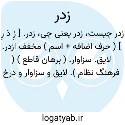 زدر. [ زِ دَ رِ ] ( حرف اضافه + اسم ) مخفف ازدر. لایق. سزاوار. ( برهان قاطع ) ( فرهنگ نظام ). لایق و سزاوار و درخور. ( از آنندراج ) ( ناظم الاطباء ). لایق و سزاوار است و آنرا درخور نیز گویند. ( جهانگیری ). لایق و زیبا. اندرخور، درخورد، درخور، سزاوار، شایان و فراخور مترادف این اند. ( شرفنامه منیری ):