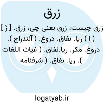 زرق. [ زَ ] ( اِ ) ریا. نفاق. دروغ. ( آنندراج ). دروغ. مکر. ریا.نفاق. ( غیاث اللغات ). ریا. نفاق. ( شرفنامه منیری ).ریا. نفاق. دورنگی. غدر. مکر... پرهیزگاری از روی ریا و دروغ. ( ناظم الاطباء ). دورنگی. دوروئی. نفاق. تزویر. ریاکاری. ( فرهنگ فارسی معین ). ریو. ترفند. ریو و رنگ. فن. بند. حیله. مکر. شید. سالوس. ریا. فریب. حیلت. ( از یادداشتهای بخط مرحوم دهخدا ):