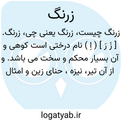 زرنگ. [ زَ رَ ] ( اِ ) نام درختی است کوهی و آن بسیار محکم و سخت می باشد. و از آن تیر، نیزه، حنای زین و امثال آن سازند. گویند آتش آن قریب به چهل شبانه روز «؟» بماند. ( برهان ) ( ازانجمن آرا ) ( از آنندراج ). درختی است کوهی که اگر آتش آن ضبط کنند، مدتی بماند و تیر و زین و گوی از چوب آن سازند. ( فرهنگ رشیدی ) ( از جهانگیری ). نام درختی بزرگ و بسیار محکم و سخت. ( ناظم الاطباء ). درختی است بغایت سخت که در کوه باشد و هیچ ثمر ندارد و هیزم را شاید و چون آتش او در خاک پوشند مدت ده پانزده روز بماند. ( اوبهی ). درختی است کوهی که بار نیاورد و هیزم سازند و اگر آتش آن در خاک بپوشند ده روز بماند بلکه بیشتر. ( لغت فرس اسدی چ اقبال ص 262 ):