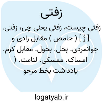 زفتی. [ زُ ] ( حامص ) مقابل رادی و جوانمردی. بخل. بخول. مقابل کرم. امساک. ممسکی. لئامت. ( یادداشت بخط مرحوم دهخدا ). حرص. طمع. ( ناظم الاطباء ):