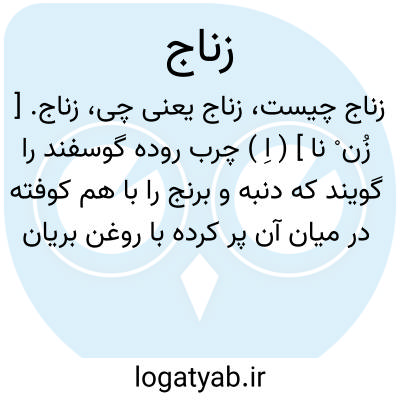 زناج. [ زُن ْ نا ] ( اِ ) چرب روده گوسفند را گویند که دنبه و برنج را با هم کوفته در میان آن پر کرده با روغن بریان کرده باشند و به عربی عصیب خوانند و با جیم فارسی هم آمده است. ( برهان ) ( ناظم الاطباء ) ( از شرفنامه منیری ) ( از فرهنگ جهانگیری ). روده ای که بر آن چربی نباشد و اندرون آن به گوشت و آرد و دنبه پر کنند و به زعفران زرد کرده در روغن بریان کنند و بخورند. ( آنندراج ) ( انجمن آرا ) ( از فرهنگ رشیدی ):