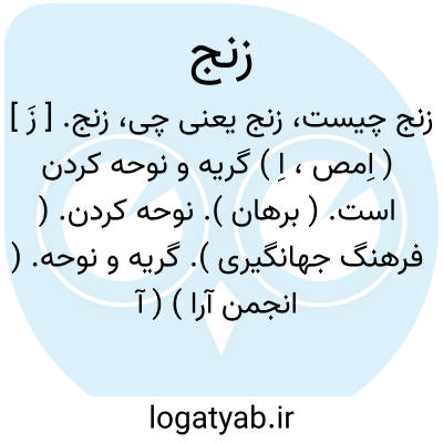 زنج. [ زِ ] ( اِ ) زاج سفید باشد و به عربی شب یمانی خوانند به تشدید بای ابجد. ( برهان ) ( از انجمن آرا ) ( از آنندراج ) ( از فرهنگ فارسی معین ). زاج سفید. ( ناظم الاطباء ). در ترجمه صیدنه... زاگ سپید...( فرهنگ رشیدی ). || جیوه. || صمغ. || سنج که یکی از آلات موسیقی باشد. ( ناظم الاطباء ). دزی در ذیل قوامیس عرب آرد: زِنج، صَنج... سنج یا چغانه خردی ازمس به قطر شش سانتی متر که کوران برای هماهنگی آوازشان آن را نوازند... ( از دزی ج 1 ص 605 ). رجوع به سنج،صنج، زنگ و ایران در زمان ساسانیان چ 2 ص 505 شود.