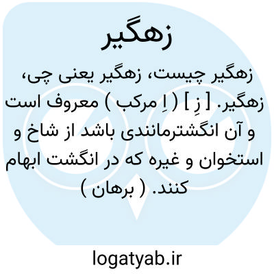 زهگیر. [ زِ ] ( اِ مرکب ) معروف است و آن انگشترمانندی باشد از شاخ و استخوان و غیره که در انگشت ابهام کنند. ( برهان ) ( آنندراج ) ( ناظم الاطباء ) ( انجمن آرا ). انگشتری باشد که از شاخ حیوان و استخوان و غیره سازند و به وقت تیراندازی در نر انگشت کنند. ( غیاث ). و زه کمان را بدان گیرند و کشند و تیر افکنند. ( انجمن آرا ) ( آنندراج ). و عوام آنرا شست گویند. ( آنندراج ). انگشتانه ای است از پوست که تیراندازان ابهام در آن کنند و آنرا چله گیر نیز نامند و عرب آن را خَتیعه گوید. ( یادداشت بخط مرحوم دهخدا ). حلقه ای انگشتانه مانند از چرم یا استخوان که در انگشت ابهام می کردند تا طناب کمان در آن تولید جراحت نکند. ( فرهنگ فارسی معین ): یک نوبت مغل بچه ای کمان گروهه در دست به زاویه او درآمد و سنگی بر مرغکی انداخت، زهگیر او از دست بیفتاد و غلطان به چاه افتاد. ( تذکره دولتشاه ترجمه کمال اسماعیل، یادداشت بخط مرحوم دهخدا ). || کنایه از فرج زن هم هست. ( برهان ). زه گیرنده. آلت تناسل زن. فرج. ( فرهنگ فارسی معین ). رحم و زهدان. ( ناظم الاطباء ). به اصطلاح لوطیان، فرج زن. ( آنندراج ).