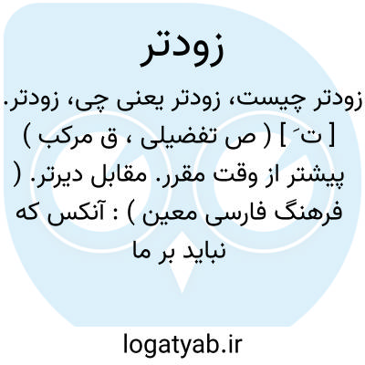 زودتر. [ ت َ ] ( ص تفضیلی، ق مرکب ) پیشتر از وقت مقرر. مقابل دیرتر. ( فرهنگ فارسی معین ):