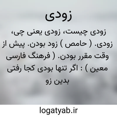 زودی. ( حامص ) زود بودن. پیش از وقت مقرر بودن. ( فرهنگ فارسی معین ): اگر تنها بودی کجا رفتی بدین زودی.( سمک عیار، از فرهنگ فارسی معین ). || بمعنی زود که گذشت. ( آنندراج ). سرعت و تعجیل و چستی و چالاکی و شتابی. ( ناظم الاطباء ). سرعت. مقابل دیری. عنقریب. تا نه دیر. ( یادداشت بخط مرحوم دهخدا ): و زودی رفتن ایشان کمتر شود. ( التفهیم بیرونی ).