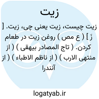 زیت. [ زَ ] ( ع اِ ) روغن. ( ترجمان القرآن ). روغن زیتون. ( دهار ) ( یادداشت بخط مرحوم دهخدا ) ( منتهی الارب ) ( آنندراج ) ( ناظم الاطباء ). روغن تخم درخت زیتون و در بعض بلاد آن را به چراغ میسوزند و برای دفع درد گزیدن زنبور اثر تمام دارد. ( غیاث ). به فارسی روغن زیتون گویند و آنچه از زیتون رسیده گیرند زیت عذب نامند و غیرمغشوش او سریعالانتشار بر سطح بدن می باشد و اجزای آن از یکدیگر منقطع نمیگردد بخلاف مغشوش... ( از تحفه حکیم مؤمن ):... کأنَّها کوکب دری یوقد من شجرة مبارکة زیتونة لا شرقیة و لا غربیة یکاد زیتها یضی ولو لم تمسسه نار نور علی نور... ( قرآن 35/24 ).