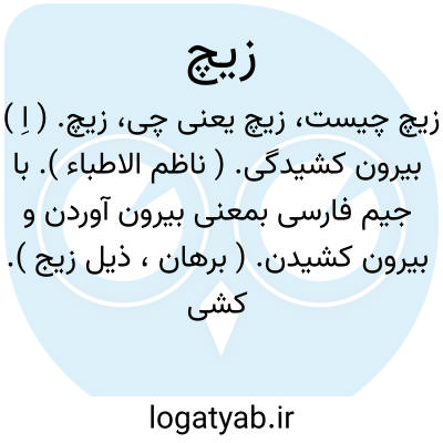 زیچ. ( اِ ) بیرون کشیدگی. ( ناظم الاطباء ). با جیم فارسی بمعنی بیرون آوردن و بیرون کشیدن. ( برهان، ذیل زیج ). کشیدن. ( جهانگیری ) ( انجمن آرا ) ( آنندراج ). || ( ص ) خوش و چابک و جلد و خوش وضع را نیز گویند. ( برهان، ذیل زیج ). چست وچالاک و جلد و قابل و خوش و خوش وضع. ( ناظم الاطباء ). چست و چابک و خوش وضع. ( جهانگیری ) ( از انجمن آرا ) ( از آنندراج ). خوش طبع و ظریف. ( انجمن آرا ) ( آنندراج ). || ( اِ ) نوعی ازانگور به غایت خوش لذت باشد. ( برهان، ذیل زیج ). نوعی از انگور بغایت لذیذ. ( ناظم الاطباء ). نوعی از انگوررا گویند که در غایت... و خوش لذتی باشد. ( جهانگیری ). نوعی از انگور. ( انجمن آرا ) ( آنندراج ). نوعی انگوربسیار خوش طعم و لذیذ است. ( یادداشت بخط مرحوم دهخدا ). || بمعنی لاغ و مسخرگی هم آمده است. ( برهان، ذیل زیج ). لاغ و مسخرگی و بذله. ( ناظم الاطباء ). || ( ص ) خوش طبع و ظریف. ( فرهنگ فارسی معین ). رجوع به زیج شود. || ( اِ ) زهوار کفش و موزه را هم می گویند. ( برهان، ذیل زیج ). کفش و موزه. ( ناظم الاطباء ). || یک نوع طرازی که در زردوزی استعمال می کنند. زیج. ( ناظم الاطباء ). رجوع به زیج شود. || راه نفس. ( انجمن آرا ) ( آنندراج ).و رجوع به معنی ششم زیج شود. || آنچه منسوب به منجمان است. ( انجمن آرا ) ( آنندراج ). زیج. ( فهرست ولف ). همان زیج که مذکور شد. ( شرفنامه منیری ).