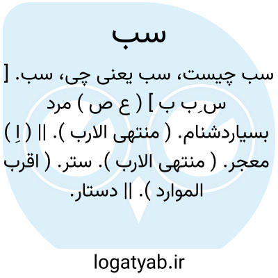 سب. [ س ِب ب ] ( ع ص ) مرد بسیاردشنام. ( منتهی الارب ). || ( اِ ) معجر. ( منتهی الارب ). ستر. ( اقرب الموارد ). || دستار. ( غیاث ) ( منتهی الارب ). عمامه. ( مهذب الاسماء ). || رسن. ( منتهی الارب ) ( دهار ) ( مهذب الاسماء ) || میخ. ( منتهی الارب ) ( مهذب الاسماء ). || جامه کتان تنک. ( منتهی الارب ). جامه باریک. ( مهذب الاسماء ) ( اقرب الموارد ).
