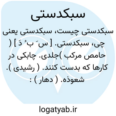 سبکدستی. [ س َ ب ُ دَ ] ( حامص مرکب )جلدی. چابکی در کارها که بدست کنند. ( رشیدی ). شعوذه. ( دهار ): و اسود از بنی مذحج بود و چیزها کردی شگفت که مردم را عجب آمدی از سبکدستی او و بزبان فصیح و گشاده و سخندان بود. ( قصص الانبیاء ص 234 ).