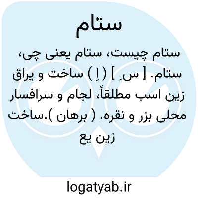 ستام. [ س ِ ] ( اِ ) ساخت و یراق زین اسب مطلقاً، لجام و سرافسار محلی بزر و نقره. ( برهان ).ساخت زین یعنی لجام و یراق زین اسب محلی بزر و نقره. ( انجمن آرا ). ساخت مرکب. ( رشیدی ). زیوری است که به اسب تعلق دارد. ( غیاث ). استام. اوستام: