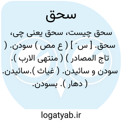 سحق. [ س َ ] ( ع مص ) سودن. ( تاج المصادر ) ( منتهی الارب ). سودن و سائیدن. ( غیاث ).سائیدن. ( دهار ). بسودن. ( المصادر زوزنی ). || کوفتن یا ریزه ریزه کردن. ( منتهی الارب ) ( آنندراج ). سخت کوفتن. ( اقرب الموارد ). || ستردن سر کسی را. ( منتهی الارب ) ( از اقرب الموارد ). || جاری گردانیدن چشم اشک را. ( منتهی الارب ) ( ناظم الاطباء ) ( از اقرب الموارد ). || محو و ناپدید کردن آثار رفتن را. ( منتهی الارب ) ( آنندراج ) ( از اقرب الموارد ). || کهنه گردانیدن جامه را. ( منتهی الارب ) ( از اقرب الموارد ). || کشتن.( منتهی الارب ). کشتن شپش را. ( منتهی الارب ) ( ناظم الاطباء ) ( از اقرب الموارد ). || کهنه شدن جامه. ( منتهی الارب ). || سخت دویدن ستور یا پویه رفتن آن. ( منتهی الارب ) ( ناظم الاطباء ) ( از اقرب الموارد ). رجوع به ساحقه شود. || ( اصطلاح تصوف ) بمعنای محو. و مراد از سحق محو عین ذات است. و مراد از محق، محو اعیان صفاتست و مراد از طمس، محو آثارصفات و ذات. ( نفایس الفنون ). یعنی از میان رفتن و در اصطلاح بی خودی بنده است در جنب قهاریت حق. ( فرهنگ مصطلحات عرفاء سجادی ). || ( اِ ) جامه کهنه.( منتهی الارب ) ( اقرب الموارد ). || ابر تنک. ( منتهی الارب ). || نشانه ریش پشت شتر، که به شده و جای آن سپید باشد. ( ذیل اقرب الموارد ).