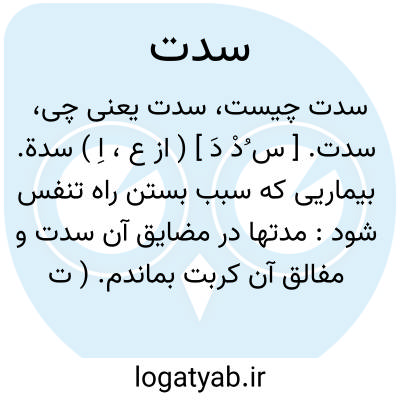 سدت. [ س ُدْ دَ ] ( از ع، اِ ) سدة. بیماریی که سبب بستن راه تنفس شود: مدتها در مضایق آن سدت و مفالق آن کربت بماندم. ( ترجمه تاریخ یمینی ص 17 ). رجوع به سدة شود. || در خانه: و این حسنه با سوابق ایادی و عواطف و سوالف عوائد و عوارف که در مدت عمر از ساحت جلال و سدت انعام و افضال او یافته ام مضاف کردم. ( ترجمه تاریخ یمینی ص 8 ). رجوع به سدة شود.