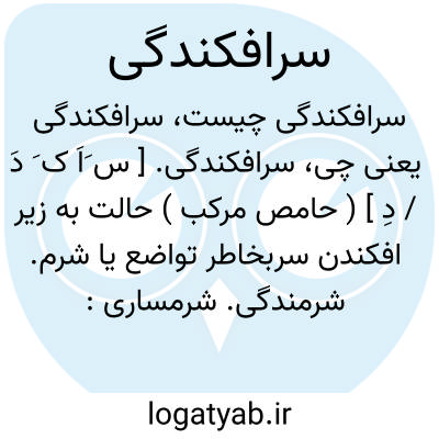 سرافکندگی. [ س َاَ ک َ دَ / دِ ] ( حامص مرکب ) حالت به زیر افکندن سربخاطر تواضع یا شرم. شرمندگی. شرمساری: