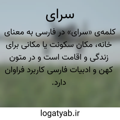 کلمه‌ی «سرای» در فارسی به معنای خانه، مکان سکونت یا مکانی برای زندگی و اقامت است و در متون کهن و ادبیات فارسی کاربرد فراوان دارد. این واژه ریشه در زبان فارسی و فرهنگ کهن دارد و علاوه بر معنای مسکونی، گاهی به معنای محل تجمع افراد، مانند سراهای تجاری یا مهمان‌سرا نیز به کار می‌رود. در ادبیات، سرای می‌تواند اشاره‌ای به محیطی گرم و صمیمی برای زندگی، آرامش و حفاظت داشته باشد و با مفاهیمی مانند خانه، منزل، دیار و مسکن هم‌معنی است. کاربرد این واژه تنها محدود به زندگی شخصی نیست و در تاریخ ایران، سرای‌ها گاهی به عنوان محل‌های تجمع بازرگانان، کاروان‌سراها یا مکان‌های عمومی برای انجام امور اجتماعی شناخته می‌شدند. علاوه بر این، سرای در مکالمات روزمره و متون ادبی به طور نمادین نیز برای اشاره به آرامش، آسایش و پناهگاه مورد استفاده قرار می‌گیرد. به طور کلی، این واژه مفهومی گسترده دارد که هم شامل خانه و محل زندگی فرد می‌شود و هم محیطی است برای تجمع و فعالیت اجتماعی، و با واژه‌های خانه، منزل و دیار هم‌معنی است.
