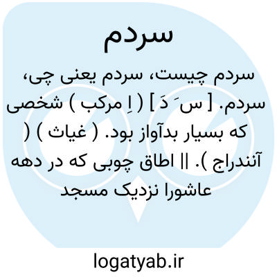 سردم. [ س َ دَ ] ( اِ مرکب ) شخصی که بسیار بدآواز بود. ( غیاث ) ( آنندراج ). || اطاق چوبی که در دهه عاشورا نزدیک مسجد یا تکیه برپا میکردند و آن را با شمایل ائمه و بزرگان و قالیچه ها و لوازم درویشی ( تبرزین، شمشاد، کشکول و غیره ) می آراستند و شبها از واردین پذیرائی میکردند و گاه به مشاعره می پرداختند و شخص غالب مخاطب را در حین خواندن اشعار بتدریج وادار به کندن جامه ها میکرد تا او را با یک لنگ از سردم خارج مینمود و اشیاءسردم را مالک میشد. || ( زورخانه ) محل سکومانند که مشرف بر گود است و مرشد بر آن قرار گیرد و همراه ضرب ورزش را رهبری کند. ( فرهنگ فارسی معین ).