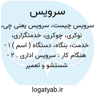 ( اسم ) ۱ - هنگام کار: سرویس اداری. ۲ - شستشو و تعمیر اتومبیل و ماشینهای دیگر. ۳ - اتومبیلی که در خدمت کارمندان باشد سرویس عمومی سرویس اختصاصی. ۴ - واحد برای ظروف و امثال آن دست یک دست چایخوری.