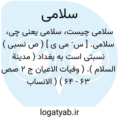 سلامی. [ س َ می ی ] ( ص نسبی ) نسبتی است به بغداد ( مدینة السلام ). ( وفیات الاعیان ج 2 صص 63 - 64 ) ( الانساب سمعانی ).