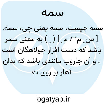 سمه. [ س ِ م َ / م ِ ] ( اِ ) به معنی سمر باشد که دست افزار جولاهگان است، و آن جاروب مانندی باشد که بدان آهار بر روی تاره جامه کشند. ( برهان ) ( آنندراج ) ( از ناظم الاطباء ). آبگیر کوچک که جولاهان دارند و در مؤید به معنی ماله آهار و لیف جولاهان که بدان آهار بر کار باشد. ( فرهنگ رشیدی ). ماله جولاهان باشد از لیف و جامه را بدان آهار دهند. ( صحاح الفرس ). || رنگ آب را گویند و آن چیزی باشد سبز که در روی آبهای ایستاده بهم رسد. ( برهان ) ( آنندراج ). سبزی که در آب روید و جامه غوک گویند و لهذا او را بزغه نیز گویند، زیرا که بزغ یعنی غوک در آن پنهان شود و به عربی عرمض گویند و بعضی سمر گفته اند ظاهراً مصحف سمه. ( فرهنگ رشیدی ). زنگ آب یعنی چیزی سبز که بر روی آبهای ایستاده و راکد بهم رسد. ( ناظم الاطباء ). || چوبی باشد بقدر یک وجب و سری پهن دارد و جولاهگان کرباس بنورد پیچیده را بدان مالش دهند تا هموار شود. ( برهان ) ( آنندراج ) ( ناظم الاطباء ).چوبی که بقدر یک دو دست و سر پهن دارد و کرباس که بر نورد پیچیده باشند بدان مالند. ( فرهنگ رشیدی ). || ( ص ) پوشیده و پنهان. ( برهان ) ( غیاث ) ( آنندراج ). مخفی. پنهان. نهفته. پوشیده. ( ناظم الاطباء ).