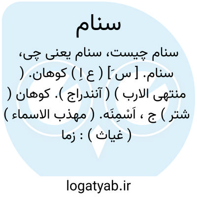 سنام. [ س َ] ( ع اِ ) کوهان. ( منتهی الارب ) ( آنندراج ). کوهان ( شتر ) ج، اَسْمِنَه. ( مهذب الاسماء ) ( غیاث ):