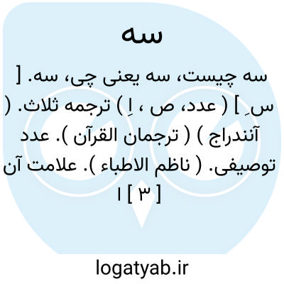 سه. [ س ِ ] ( عدد، ص، اِ ) ترجمه ثلاث. ( آنندراج ) ( ترجمان القرآن ). عدد توصیفی. ( ناظم الاطباء ). علامت آن [ 3 ] است. دو بعلاوه یک. ( ناظم الاطباء ):