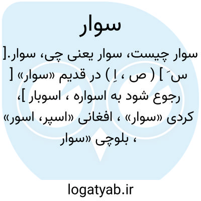 سوار.[ س َ ] ( ص، اِ ) در قدیم «سوار» [ رجوع شود به اسواره، اسوبار ]، کردی «سوار»، افغانی «اسپر، اسور»، بلوچی «سوار» ( اشتقاق اللغة ص 749، کلمه فارسی «سوآر، اسوار» )، پهلوی «اسبار» مأخوذ از پارسی باستان «آسابارا». رجوع به نیبرگ ص 278. لغتاً به معنی برنده اسب. و رجوع شود به اسوار و اسوبار؛ کسی که بر روی اسب و ستوران دیگر نشیند. ( از حاشیه برهان قاطع چ معین ). راکب. ( غیاث ). فارس. ( دهار ). راکب اسب است و به معنی راکب دیگر سواریها مجازاً باشد چه مخفف اسوار است و اسوار مرکب اسب از لفظ اَسْوْ که بر وزن سرو باشد مبدل است و لفظوار کلمه نسبت است. ( غیاث ) ( از آنندراج ):