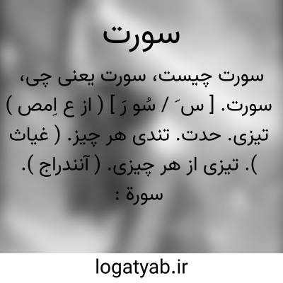 سورت. [ س َ / سُو رَ ] ( از ع اِمص ) تیزی. حدت. تندی هر چیز. ( غیاث ). تیزی از هر چیزی. ( آنندراج ). سورة: در خانه پیرزنی از عجائز بخارا متواری شد تا فورت حادثه و سورت واقعه او سکون یافت. ( ترجمه تاریخ یمینی ). رجوع به سورة شود. || برجستن شراب بسوی دماغ. ( آنندراج ): ساغری چند شراب خورده بود و سورت مستی استیلا یافته. ( ترجمه تاریخ یمینی ). || شدت سردی وشدت تب. ( آنندراج ). || ظلم و خشم. ( غیاث ). خشم سلطان و بیدادی او. ( آنندراج ): او چون سورت آن شیران و صولت آن دلیران مشاهده کرد انگشت ندامت گزیدن گرفت. ( ترجمه تاریخ یمینی ). که از حدت و سورت پادشاهان برحذر باید بودن. ( گلستان سعدی ).