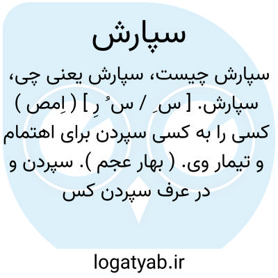سپارش. [ س ِ / س ُ رِ ] ( اِمص ) کسی را به کسی سپردن برای اهتمام و تیمار وی. ( بهار عجم ). سپردن و در عرف سپردن کسی را به کسی برای اهتمام و تیمار وی. ( آنندراج ): اگر در مصاف یکی کشته آید نامش ازجریده بندگان مسترید و فرزندش را نیکو دارید تا رغبت در سپارش جان زیادت شود. ( راحة الصدور راوندی ).