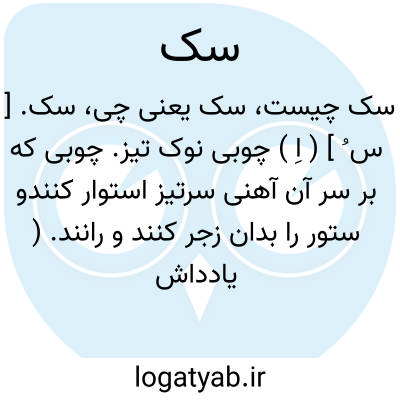 سک. [ س ُ ] ( اِ ) چوبی نوک تیز. چوبی که بر سر آن آهنی سرتیز استوار کنندو ستور را بدان زجر کنند و رانند. ( یادداشت مؤلف ).چوبی بمقدار وجبی که بر سر آن آهنی نوک تیز چون جوالدوزی استوار کنند و خربندگان بدان خر را رانند. ( یادداشت مؤلف ). || نکبت و فلاکت. ( برهان ). || مرکبی است و گویند عصاره آمله، مقوی دل،خوشبو. ( الفاظ الادویه ). عصاره آمله. ( از اختیارات بدیعی ) ( برهان ) ( تحفه حکیم مؤمن ) ( منتهی الارب ) ( ازآنندراج ). سک اصلی از آمله است و بعضی از مازو کنند. گرم است بدرجه اول و خشک بدرجه دوم. درد عصب را سود دارد قابض است و زداینده. ( ذخیره خوارزمشاهی ).