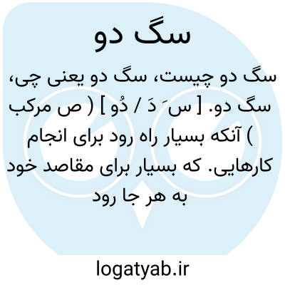 سگ دو. [ س َ دَ / دُو ] ( ص مرکب ) آنکه بسیار راه رود برای انجام کارهایی. که بسیار برای مقاصد خود به هر جا رود. که سخت بسیار راه تواند رفتن. ( یادداشت مؤلف ). || آنکه فعالیت زیاد کند و نتیجه نگیرد. ( فرهنگ فارسی معین ).