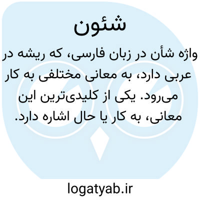 ۱ - کار حال. ۲ - امر بزرگ امر مهم جمع شئون ( شوئ ون ) جمع الجمع: شئونات. در شئامت. در حق درباره.