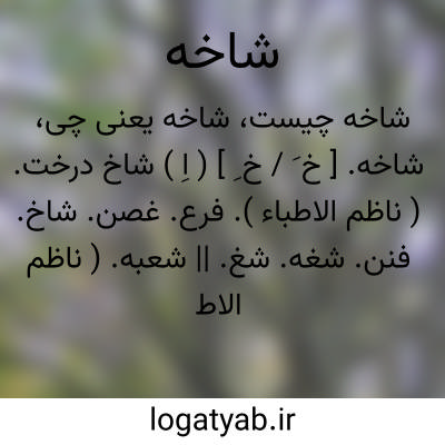 ( اسم ) ۱ - انشعابی که از تنه درخت جدا میشود و حامل برگ و گل و انشعابات کوچکتر است شاخ درخت غصن. ۲ - شاخ حیوان قرن. ۳ - جام شراب که به شکل شاخ بود. ۴ - شعبه. ۵ - تقسیمات بزرگ و کلی گیاهان و جانوران را گویند. در هر شاخه صفات بسیار کلی موجودات گیاهی یا جانوری در نظر گرفته میشود مثلا در عالم جانوران همه حیوانات یک سلولی را در یک شاخه قرار داده و به نام آغازیان می نامند و بقیه جانوران که پر سلولی هستند در طی ۷ شاخه ذکر میشوند. در عالم گیاهان همه گیاهان در ۴ شاخه قرار گرفته اند.