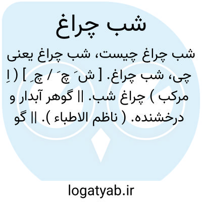 شب چراغ. [ ش َ چ َ / چ ِ ] ( اِ مرکب ) چراغ شب. || گوهر آبدار و درخشنده. ( ناظم الاطباء ). || گوهری است افسانه ای که در شب مثل چراغ میدرخشد. و قصه اش این است که گاومانند جانوری است در دریا که در شب بیرون می آید و گوهر مذکوررا از دهان خود بیرون می آورد و بر زمین می نهد و در روشنایی آن میچرد و باز آن را به دهان میگذارد و در آب میرود. مردم در کمین نشسته اند، آن گوهر را میربایند. ( فرهنگ نظام ). گوهری که در شب مانند چراغ افروزدو روشنایی دهد. ( ناظم الاطباء ). || کرم شب تاب و عربان ولدالزنا خوانندش. ( برهان قاطع ). کرم شب افروز. کرم شب تاب. ( ناظم الاطباء ). شب چراغک. چراغله. رجوع به شب تاب در معنی فوق شود. || چراغانی در شب. ( فرهنگ فارسی معین ): رسم شب چراغ در آن دیار ( ختا ) بر این موجب است که در درون کریاس پادشاه گویی سازند از چوب و روی آن چوب را به شاخ سرو پوشند و صد هزار چراغ بر ریسمانها تعبیه کنند و موشکها بر اطراف آن بندند... ( حبیب السیر چ طهران، خاتمه ص 43 ). || درّ شبگون. ( ناظم الاطباء ).