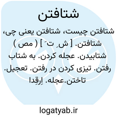 شتافتن. [ ش ِ ت َ ] ( مص ) شتابیدن. عجله کردن. به شتاب رفتن. تیزی کردن در رفتن. تعجیل. تاختن.عجله. اِرقِداد. اِستِکارَة. اِعثیجاج. اِکراب. اِکعاب. اِنصاف. اِنکِداد. ایحاف. ایخاف. ایفاد. ایفاض.تَعَجﱡل. تَعجیل. تَقَهوُس. تَکَدﱡس. تَمَرﱡغ. تَنَزﱡع. تَنَزّی. تَنَقﱡث. تَنقیث. تَوَهﱡس. تَهییک. خَذَم. ذَمیان. رَمع. رَمَع. رَمَعان. طَهق. عَجرَمَة.عَجَل. عَجَلَة. قُطور. قَهوَسَة. کَور. کَهف. لَعط. مَرط. مُغاوَلَة. مَغر. مَنکَظَة. نَکَظ. نَکظ. نَکظَة. وَشق. وَشک. هَبَص. ( منتهی الارب ):